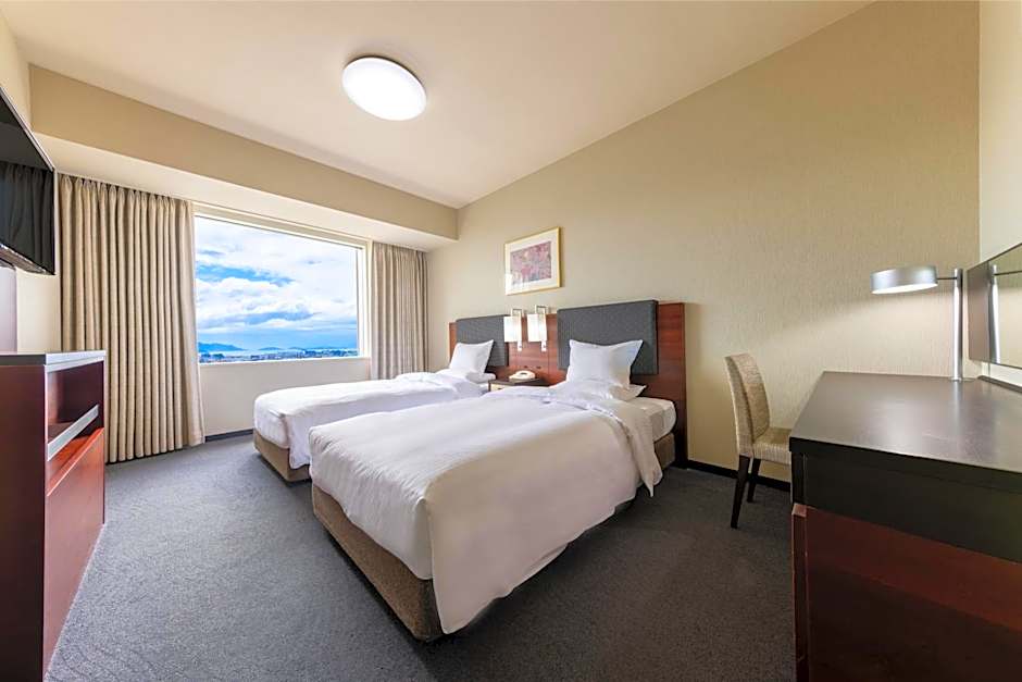 Room includes a flat-screen satellite TV and a private bathroom with bathtub. Featuring bold bed covers and dark wood furnishings, the air-conditioned rooms at Rihga Royal Hotel Hiroshima come with a desk, a hairdryer and bathroom amenities. Free WiFi is also available.